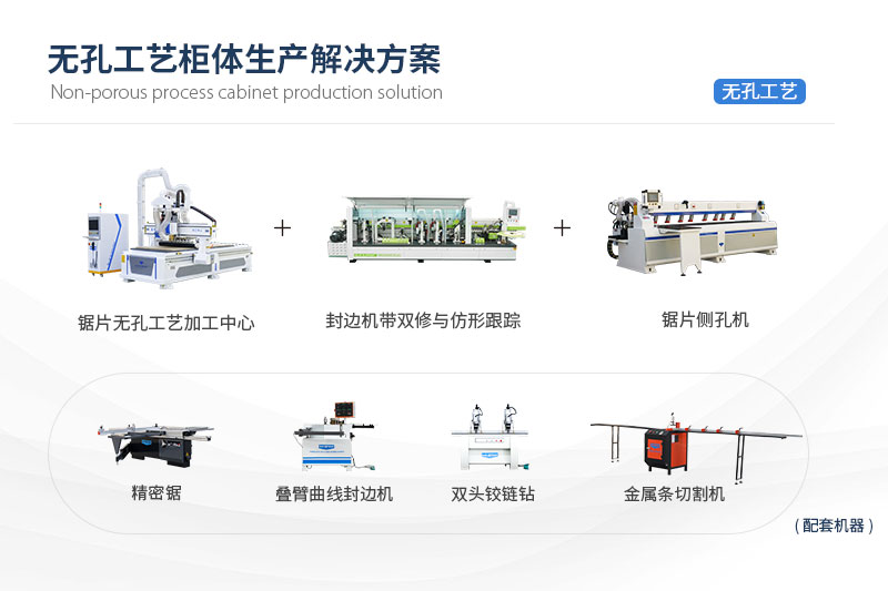 無孔工藝柜體生產(chǎn)解決方案,主要由無孔工藝加工中心、鋸片側(cè)孔機(jī)、全自動封邊機(jī)三種設(shè)備組成,可用于加工生產(chǎn)板式家具、櫥柜、衣柜、兒童家具等柜體的生產(chǎn)加工,滿足家具生產(chǎn)廠家對無孔家具(使用隱形連接件連接)、板式家具(使用二合一、三合一連接件)及普通板式家具的加工需求;